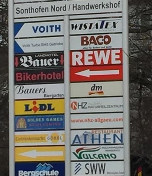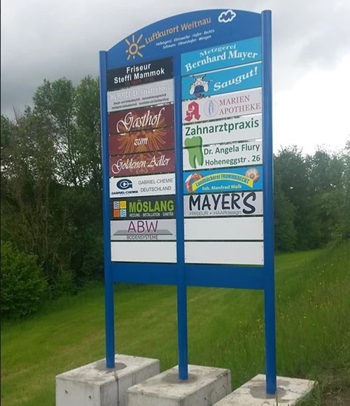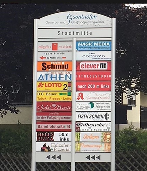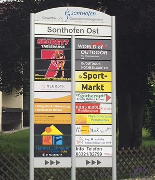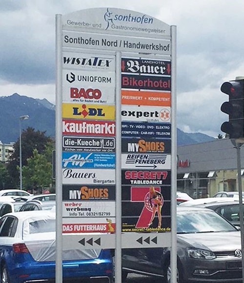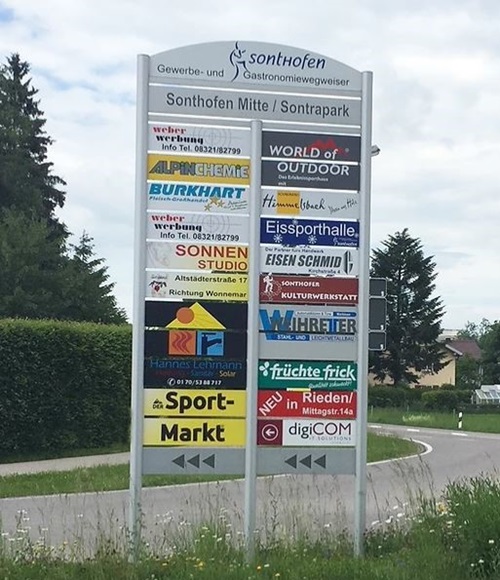 Präsentieren Sie Ihr Unternehmen auf den Werbeflächen im Wegeleitsystem der Stadt Sonthofen und erhöhen Sie Ihre Sichtbarkeit für alte und neue Kunden. Werbeflächen auf Hinweisschildern sind eine effektive und kostengünstige Möglichkeit, Ihre Firma quer durch die Stadt zu repräsentieren und Kunden auf den richtigen Weg zu bringen. Weber Werbung kümmert sich für Sie um die Vermietung und das repräsentative Erscheinungsbild Ihres Firmenschildes in den Straßen der Stadt Sonthofen. Sprechen Sie uns an, wenn Sie diese Möglichkeit wahrnehmen möchten.